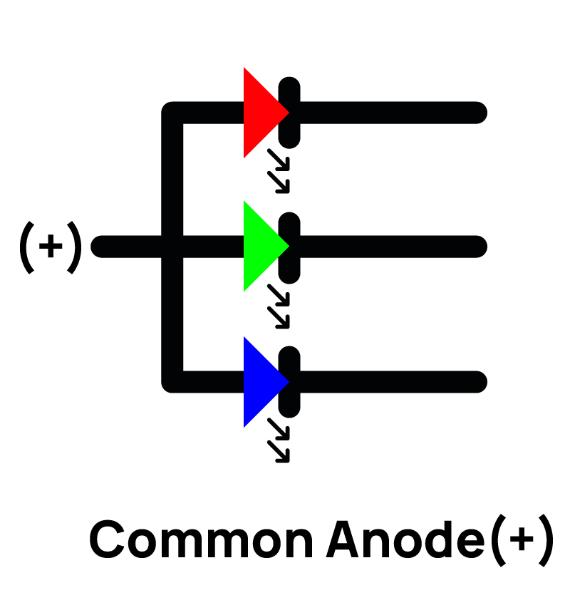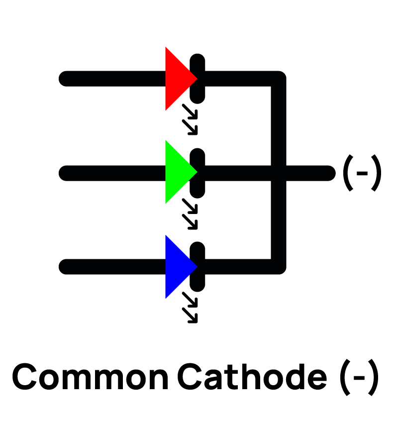 In a Common Cathode arrangement, the negative terminals (cathodes) of the Red, Green, and Blue LED chips are tied together at a single point. This shared point is connected to the ground of the circuit. Meanwhile, the positive terminals (anodes) of each color are driven individually.